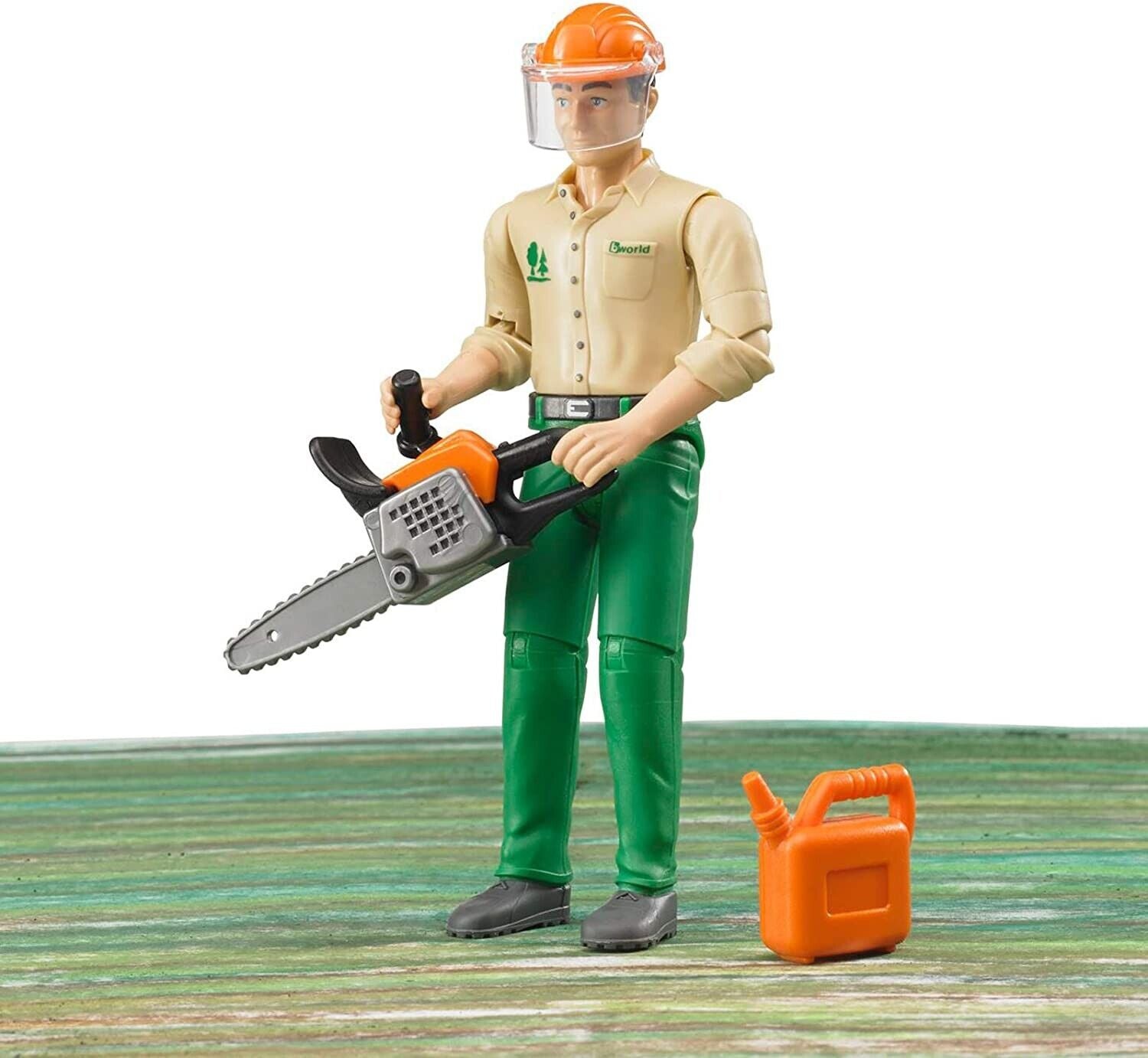 Il vasto assortimento BRUDER comprende numerosi trattori, rimorchi e attrezzi per silvicoltura. L'integrazione ideale sono i personaggi che conferiscono allo scenario complessivo del gioco un divertimento e un realismo ancor maggiori. L'operaio forestale con accessori è l'integrazione ideale per tutti gli attrezzi per silvicoltura dell'assortimento. Attrezzato "per rispetto della sicurezza" con casco e visiera, può iniziare a lavorare direttamente. Inoltre il kit comprende una sega a catena e una tanica di benzina, in modo da riprodurre più realisticamente possibile la quotidianità di un operaio forestale. La testa nonché braccia e gambe dell'operaio sono mobili e l'abbigliamento a tema.