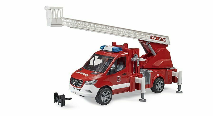 Le autopompe più piccole sono sempre più utilizzate per gli incendi difficili da combattere, per esempio nelle strade strette della città vecchia. In questo caso, lo Sprinter si è dimostrato particolarmente efficace grazie alla sua enorme maneggevolezza. BRUDER ha dotato questo camion dei vigili del fuoco di numerosi dettagli funzionali realistici. L'attenzione si concentra sulla scala girevole estensibile con gabbia di salvataggio e lo spruzzatore d'acqua funzionale con pompa a pistone visibilmente funzionante, serbatoio dell'acqua e gambe di supporto estensibili, vari contenitori per attrezzi, così come il nuovo modulo luci e suoni completano l'elevata qualità di gioco di questo veicolo.
