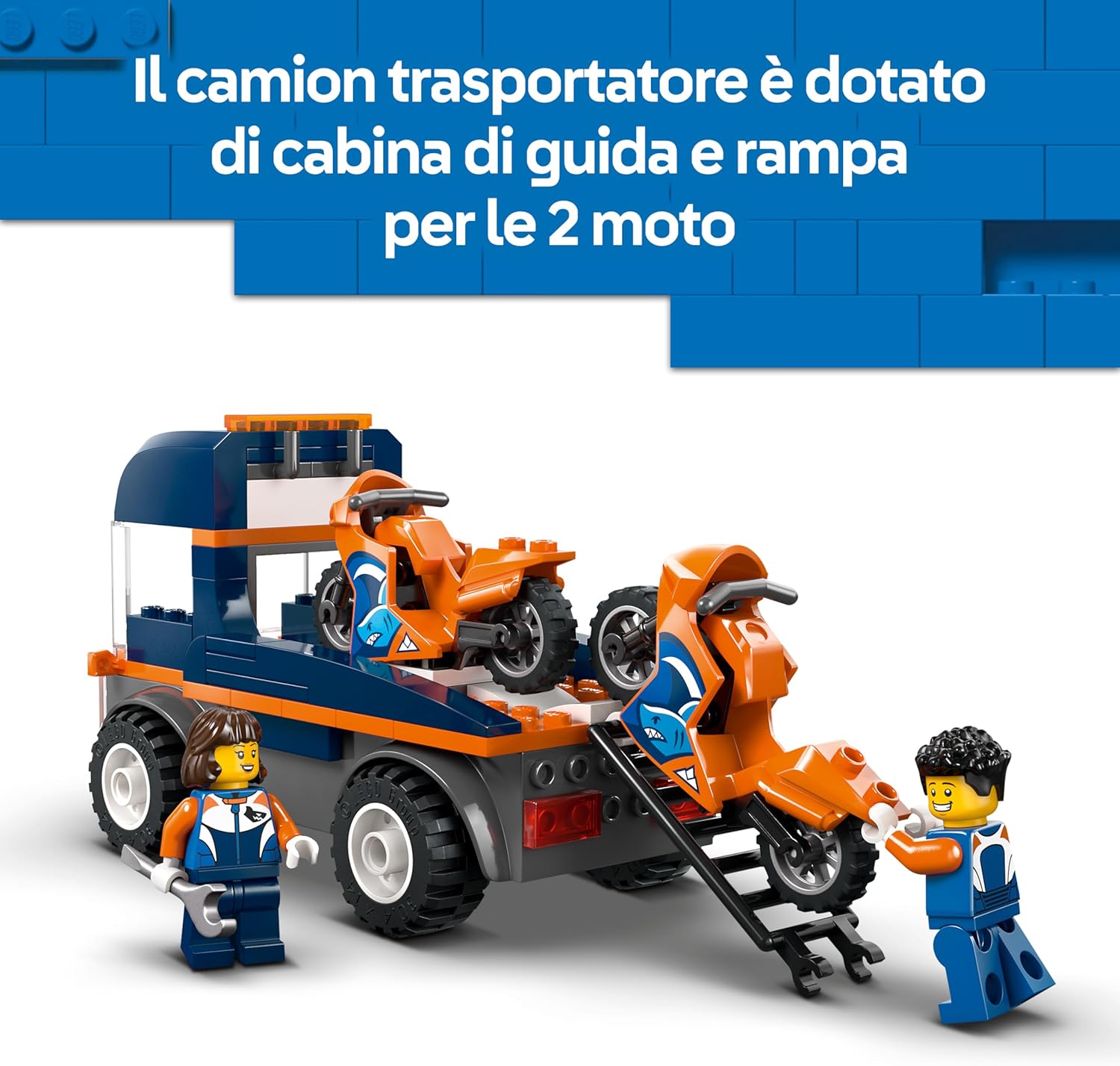 - GIOCO CREATIVO CON VEICOLI LEGO: i giovani possono posizionare una minifigure nella cabina di guida del camion giocattolo, e montare la rampa per caricare e scaricare le motociclette LEGO da trasportare