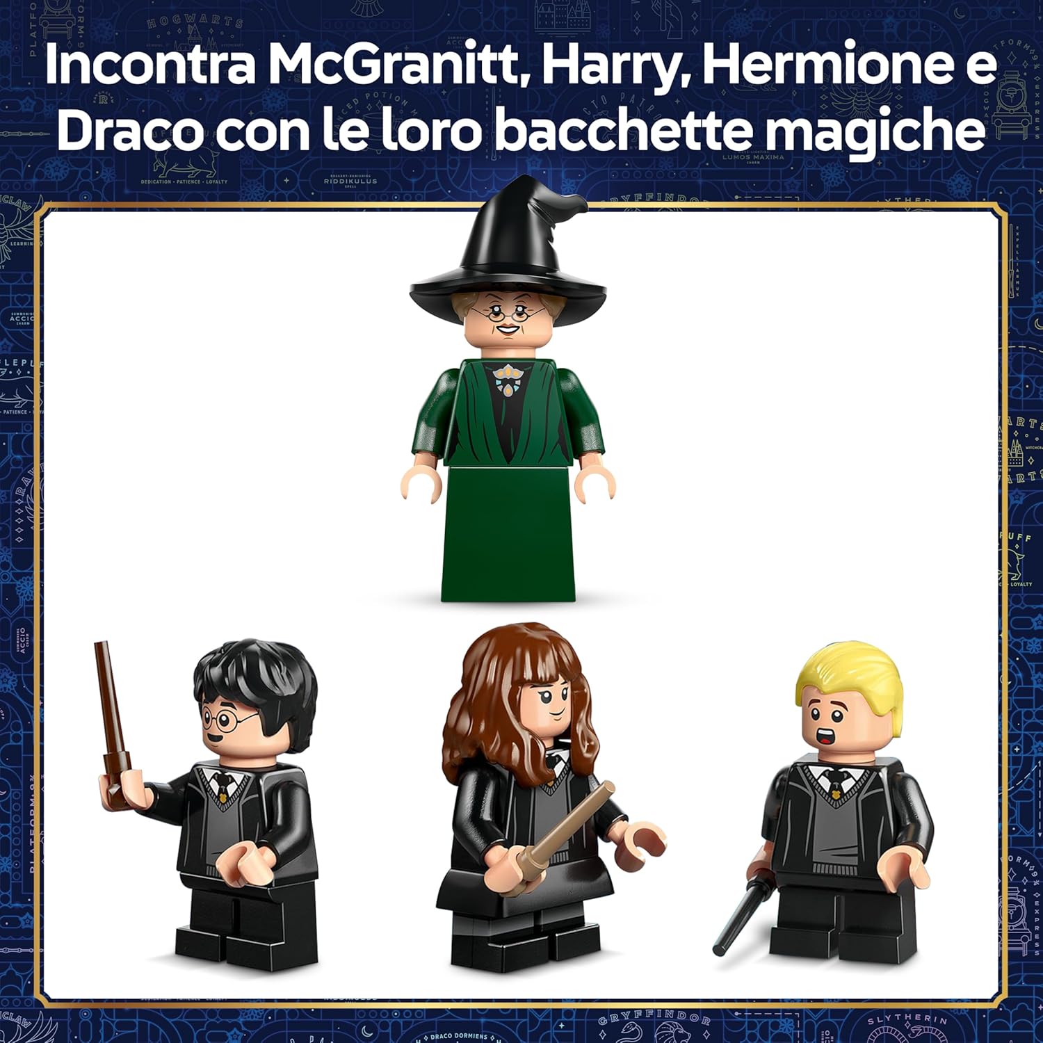 - 4 PERSONAGGI LEGO HARRY POTTER: ricrea la cerimonia del Cappello Parlante con le minifigure di Harry Potter, Hermione Granger, Draco Malfoy e della professoressa McGranitt, ciascuna con bacchetta magica