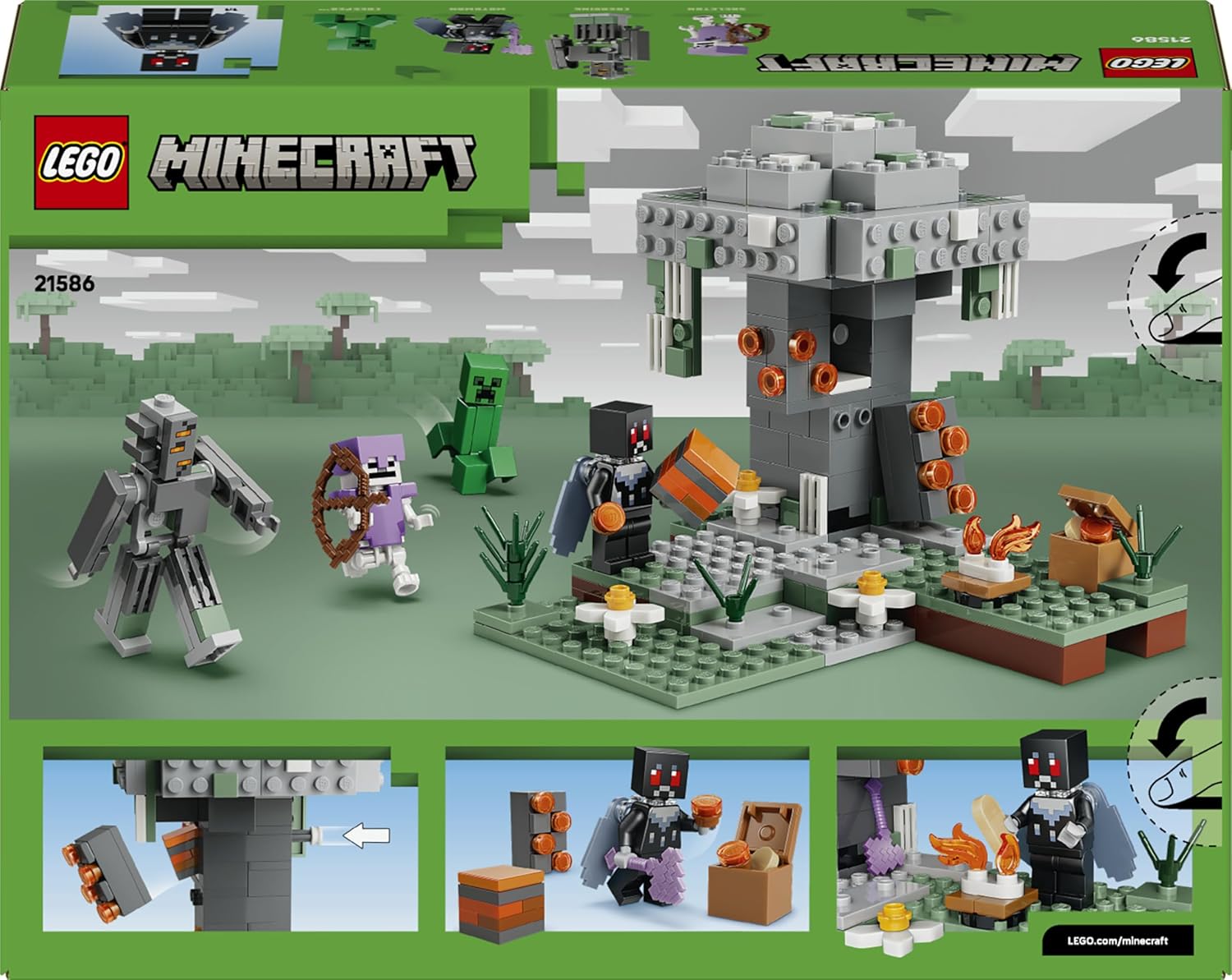 - MOB E PERSONAGGI LEGO MINECRAFT: una figura costruita con i mattoncini affronta l'eroico Mothman alato, mentre un Creeper Minecraft e uno scheletro si aggirano nel bioma del Giardino Pallido