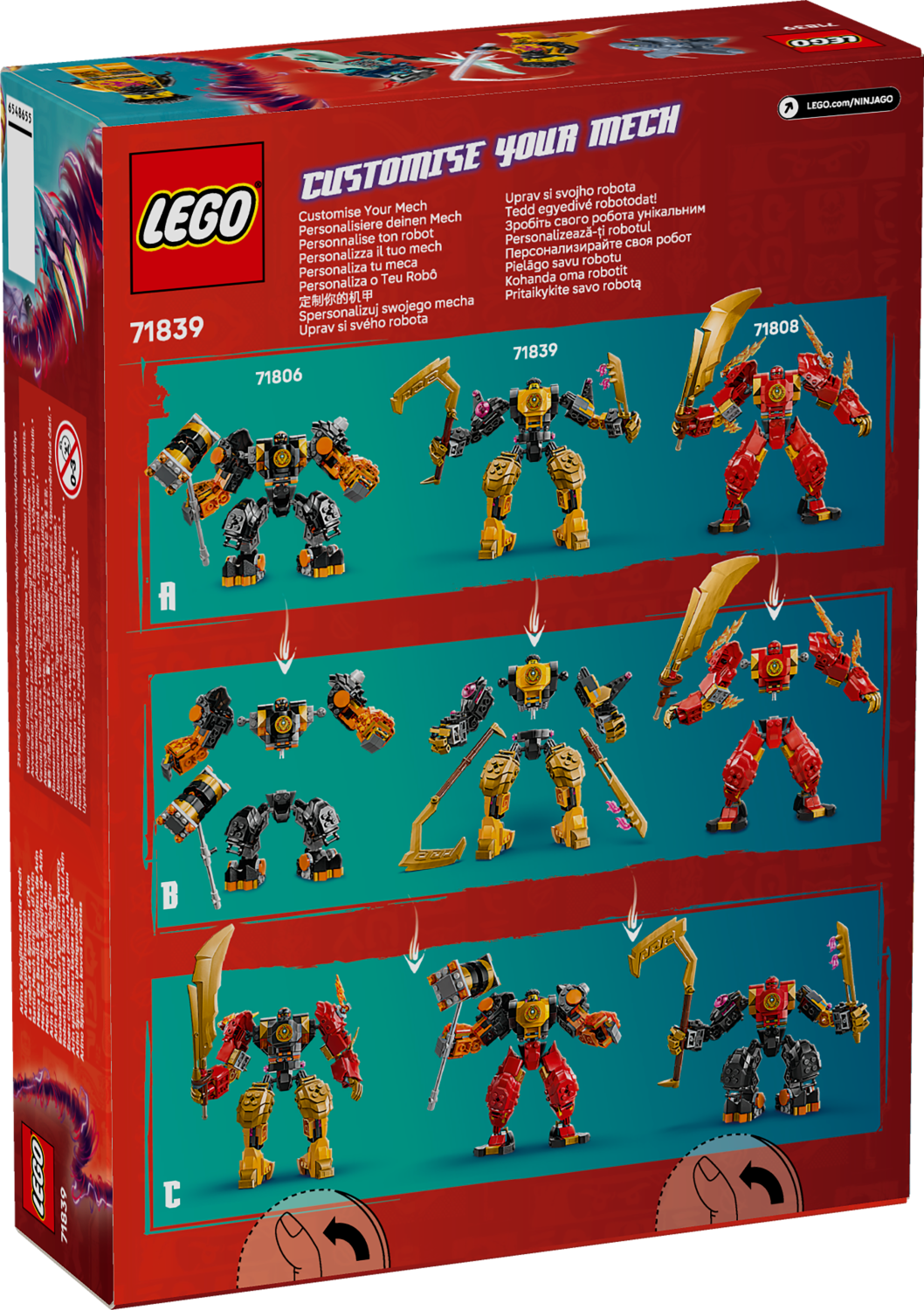 I bambini possono anche creare il proprio mech definitivo scambiando le parti del corpo del Battle Mech Spinjitzu di Arin con parti dei mech personalizzabili della gamma NINJAGO 2024 (disponibili separatamente): il Mech elemento Terra di Cole (71806), il Mech elemento Tech di Sora (71807), il Mech elemento Fuoco di Kai (71808) e il Mech degli elementi del potere di Lloyd (71817).