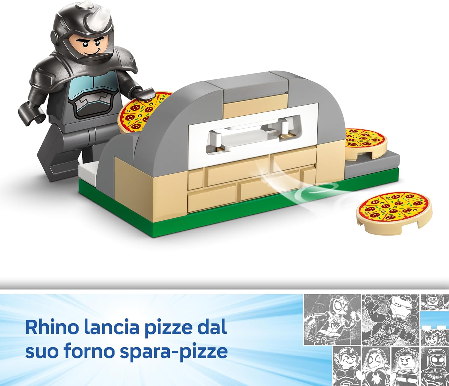 - AVVENTURE MARVEL SU RUOTE: i piccoli aiutano Spidey a recuperare la gemma blu schivando le pizze lanciate dal forno di Rhino; possono intrappolare il cattivo grazie alla grande ragnatela posizionata sulla motocicletta giocattolo